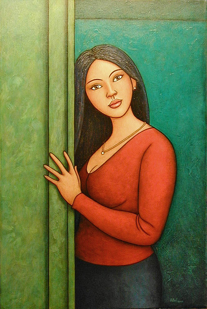 This painting is really very fresh and light. The dark hair and thickly painted eyes seem to pop off the surface of the lavenders and pinks in the background. I enjoyed painting this girl, she is full of youth, and is literally the very embodiment of the spring season.